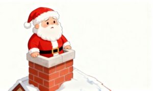 クリスマスといえば、サンタクロースがトナカイと一緒に世界中の家を回り、煙突からそっとプレゼントを届ける微笑ましい光景が思い浮かびます。しかし今回ご紹介するフリー素材イラストは、そんな定番のシーンにちょっとした“おもしろ要素”を加えた、かわいさとユーモアが詰まったクリスマスイラストです。白背景に描かれたシンプルで使いやすい構図の中で、サンタクロースが煙突から家に入ろうとするものの、なんと煙突にクリスマスの飾りがびっしり巻き付けられていて中に入れず、困った顔をしている姿がとても愛らしく表現されています。思わず微笑んでしまう表情や、ポップなタッチで描かれたお家の雰囲気が、クリスマスのワクワク感とおもしろさを同時に伝えてくれます。