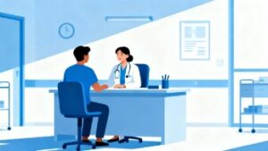 病院で行われる診察や問診、カウンセリングの場面を、わかりやすく整理された表現で描いた医療関連のフラットデザインイラスト素材です。患者と主治医が向き合い、丁寧に会話を重ねながら状態を確認していく様子は、医療現場における安心感や信頼関係をやさしく伝えます。必要に応じて看護師が同席し、検査や説明を補助する姿も表現されており、実際の病院での診療の流れをイメージしやすい構成となっています。