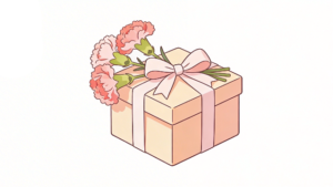 - プレゼントを彩る一輪の花:丁寧にリボンがかけられたギフトボックスの傍らに、感謝の象徴であるカーネーションを一輪添えました。これだけで、一目で母の日をテーマにした素材であることが伝わり、見る人の心を温かくさせます。