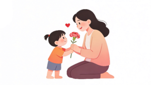 小さな手から渡される一輪のカーネーションには、言葉にできないほどの大きな愛が詰まっています。このフラットデザインのイラストが、皆様の大切なメッセージを運び、お母さんやママたちの心に笑顔を咲かせるお手伝いができれば幸いです。
