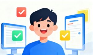 洗練されたフラットデザインと白背景による汎用性の高さ、そして「第一歩の成功」を象徴するチェックマークの効果。これらを兼ね備えたこのイラストは、デジタルサービスの第一印象を明るく彩り、利用者に安心と快適さを届けるための優れたビジュアル資産です。