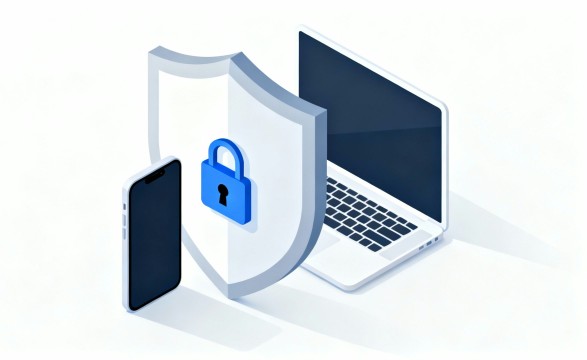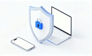 このフラットデザインのイラスト素材は、白背景を活かしたミニマルでシンプルな構成が特徴で、デジタルセキュリティの概念を明確に伝えたいシーンに最適なフリー画像です。中央に配置された大きな盾が、スマートフォンやラップトップなどのデバイスをしっかりと守り、その上に描かれたロックアイコンが、情報保護やデータの安全性を象徴しています。視覚的に直感的で、誰にでもわかりやすく、安心感を与えるデザインが魅力です。