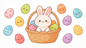 春の暖かな日差しを感じるようになると、街のあちこちで見かけるようになるのが「イースター」のデコレーションです。キリスト教の復活祭として知られるこの行事は、今や日本でも「春の訪れを祝うイベント」として定着しました。その主役といえば、子だくさんで繁栄の象徴とされる「ラビット」と、新しい生命の始まりを意味する「エッグ」。今回は、親子のうさぎがバスケットの中からひょっこりと顔を出し、カラフルなタマゴに囲まれている、優しさと幸福感に満ちたビジュアルを作成しました。