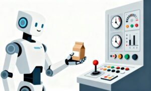 白背景にシンプルでクリーンなフラットデザインで描かれた、人型ロボットと商品の受け渡しシーンを表現したイラスト素材です。ロボットが丁寧に商品を扱う姿が印象的で、先進技術の進歩だけでなく、人と技術が自然に協調する未来を感じさせるイメージに仕上がっています。無駄のない構図でまとめられたフラットデザインは視認性が高く、幅広い場面で活用しやすい素材となっています。