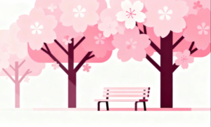 桜の木は枝ぶりや花の密度をバランスよく描写し、サクラ特有の華やかさと軽やかさをフラットなタッチで表現しています。その足元に配置されたベンチは、春の公園や散策路を思わせるモチーフとして、風景に物語性を加えています。誰かが腰掛けて花を眺めているような情景を想像でき、静かで落ち着いた時間の流れを感じさせるイメージです。