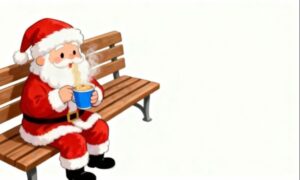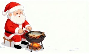 クリスマスをほんの少しユニークに楽しみたい方、おもしろいサンタのイラストを探している方、使いやすい白背景のフリー画像を利用したい方に最適の素材です。プレゼント配りの合間にほっと一息ついてみかんを味わうサンタクロースの姿で、あなたのクリスマスコンテンツに温かみと笑顔を添えてみてはいかがでしょうか。