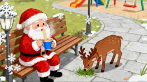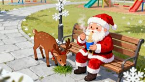 公園のベンチでカップラーメンを食べながら、クリスマスの大仕事の合間にひと休みするサンタクロースを描いた、ユーモアたっぷりのフラットベクターイラストです。普段は世界中の子どもたちにプレゼントを届ける頼もしいサンタですが、このイラストでは、まるで一般の人と同じようにラーメンを味わいながらくつろぐ姿が切り取られており、見るだけで思わず微笑んでしまう魅力があります。「あのサンタにもこんな時間があるのかもしれない」と想像したくなる、遊び心満載のデザインです。