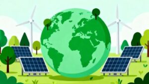 自然エネルギーの象徴である太陽光と風力の設備、成長を続ける木々、そして地球を中央に据えた構成が、持続可能な未来を視覚的に表現し、環境テーマに説得力を与えます。淡いグリーンの背景が優しく、親しみやすい雰囲気を作るため、環境問題を扱う際に重苦しさを与えないのもポイントです。