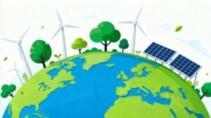 淡いグリーンの背景に、地球、ソーラーパネル、風力発電、そして豊かな木々を組み合わせ、SDGsを象徴する「エコ」や「サステナブル」な未来を表現したフラットベクターイラストです。ナチュラルで優しい色合いと、シンプルで分かりやすい構図が特徴で、環境保護や脱炭素社会、再生可能エネルギーなどをテーマにした記事やWebサイトとの相性が非常に良い素材となっています。