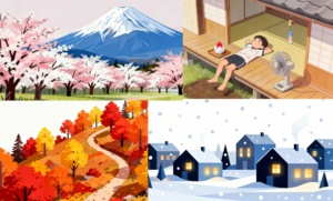 日本の豊かな情景を彩る、春夏秋冬の移ろい。今回は、それぞれの季節が持つ固有の美しさと空気感を一つのビジュアルに凝縮した、四季のまとめ イラスト素材をご紹介します。