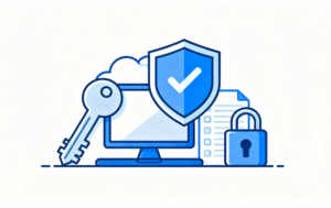 クラウドサービスやファイル共有の安全性を説明するシーンでは、こうしたロックやシールドのイメージが非常に有効です。情報がしっかり守られていることを直感的に伝えながらも、白背景によって余計な要素が省かれ、資料本来の内容を邪魔することなく自然に馴染みます。ブルーを主体としたカラーリングは信頼、清潔感、正確さを象徴し、セキュリティのテーマとの相性も抜群です。