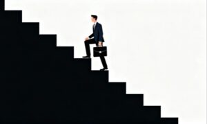 白基調の背景により、視認性が高く、コンテンツのメイン情報を引き立てつつ、明るくクリーンな雰囲気を演出します。キャリアの成長や成功をテーマにしたブログやコラム、人材育成・教育関連のページ、企業のビジョン紹介などにも最適です。また、階段を昇る姿は挑戦や前進の象徴としてさまざまな文脈に応用でき、ビジネスパーソンのイメージ素材として非常に扱いやすいデザインとなっています。