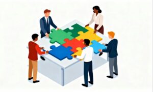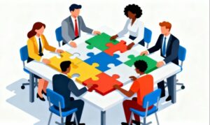 クリーンな白背景に、多様なビジネスチームが協力して巨大なジグソーパズルを組み立てているアイソメトリックなフラットデザインのイラスト素材です。オフィスの会議室を思わせるテーブルを囲み、複雑な問題に向き合いながら解決策を模索するチームの姿を象徴的に描いており、ビジネスシーンにおけるチームワークや協働の価値を視覚的に伝えることができます。ミーティングやワークショップ、プロジェクトの進行を表現するイメージとして、資料やWebサイトに取り入れやすい汎用性の高い素材です。