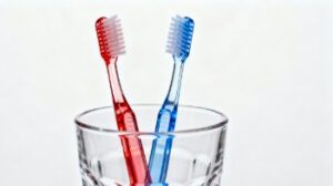 白背景にガラスのコップを置き、その中に赤色のハブラシと青色のハブラシがすっきりと立てられた、生活風景を切り取った写真素材です。余計な要素を排したシンプルな構図により、清潔感と整った印象が自然と伝わる一枚となっています。ガラスの透明感と、ハブラシのはっきりとした色合いが美しく映え、全体的にきれいめで使いやすいイメージに仕上がっています。