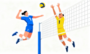 バレーの象徴的な攻防である「スパイク」と「ブロック」を同時に描いた構図は、競技の魅力を分かりやすく伝えることができ、スポーツ解説やチーム紹介、技術説明、イベント案内など、多彩なシーンで効果を発揮します。シンプルなフラットデザインは、情報を整理して伝えたいときにも適しており、読み手にストレスを与えず視覚的な補助として役立ちます。スポーツ関連のページをより印象的に演出したい場合にも最適です。